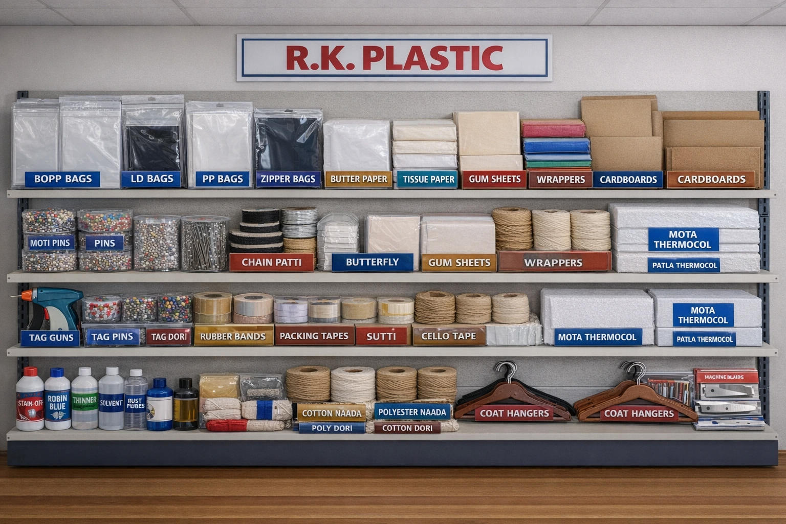 Established in 2008, R.K. Plastic is a leading supplier of garment packaging materials in Gandhi Nagar, Delhi. We cater to wholesalers, manufacturers, and retailers with a wide range of products including polybags, cardboard, tags, clips, hangers, and packaging accessories.